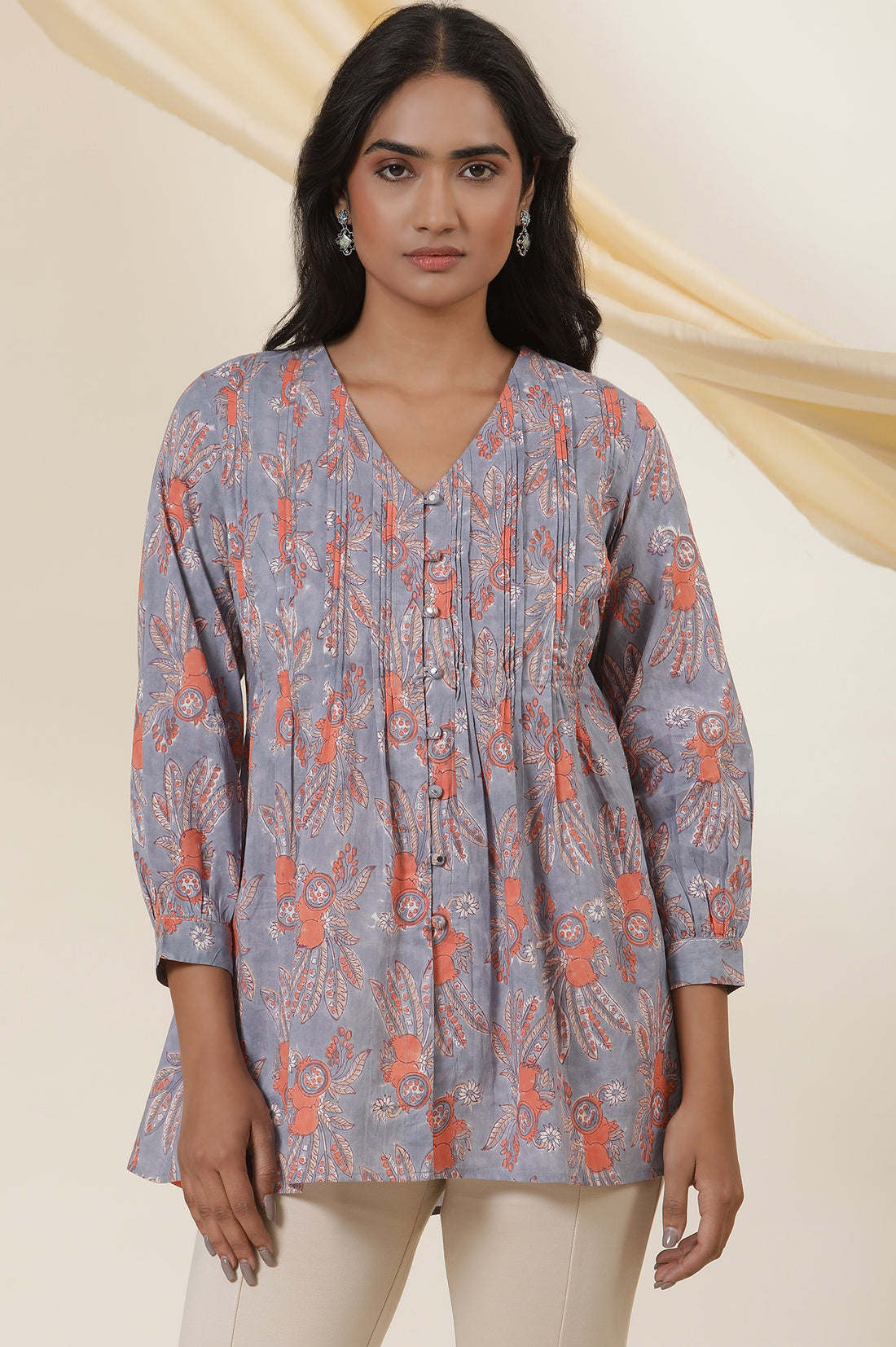 Blue Cotton Multi-Coloured Block Print Pleated Top