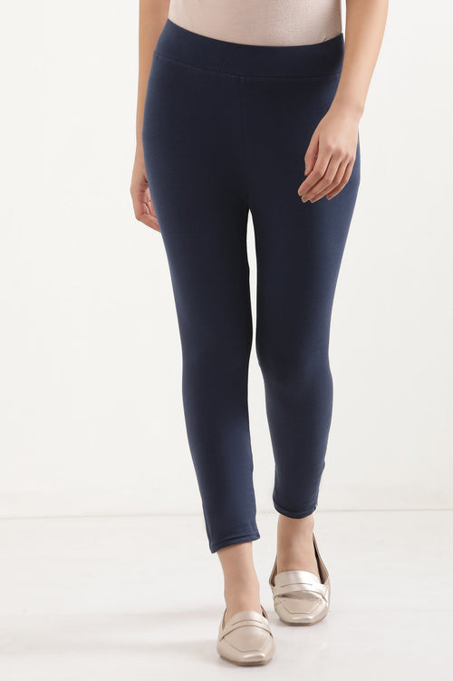 Crafted for effortless style and comfort, these navy blue cropped tights are a wardrobe essential. Made from a soft cotton lycra blend, they feature a mid-rise elasticated waistband for a secure fit and a sleek silhouette. The solid pattern and skinny fit make them versatile for casual outings or relaxed evenings. Pair them with a straight kurta or a chic top to create a polished look that transitions seamlessly from day to night.