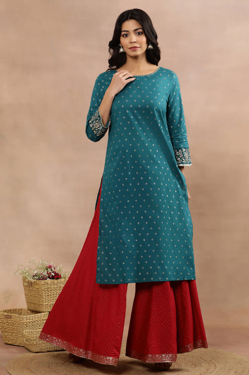 Deck Up For The Wedding Celebrations In This Pretty Kurta And Culottes Set. The Set Has Blu Embellished Straight Kurta And Has Sequin Detail On Neckline. And It Is Paired With Contrasting Glitter Printed Flared Culottes.