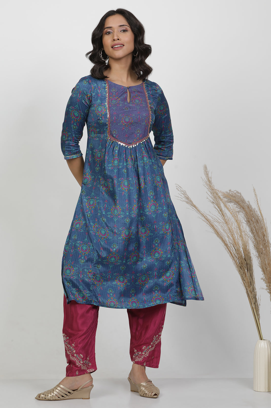Blue Embroidered Straight Kurta Which Is Adorned With Sequins On Yoke. It Is Paired With Contrasting Shantung Embroidered Salwar Pants.