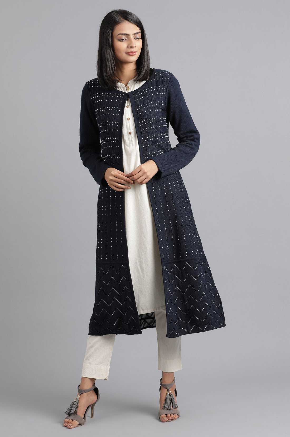 Blue flared cardigan with stitch line detail. It is made up of acrylic viscose.