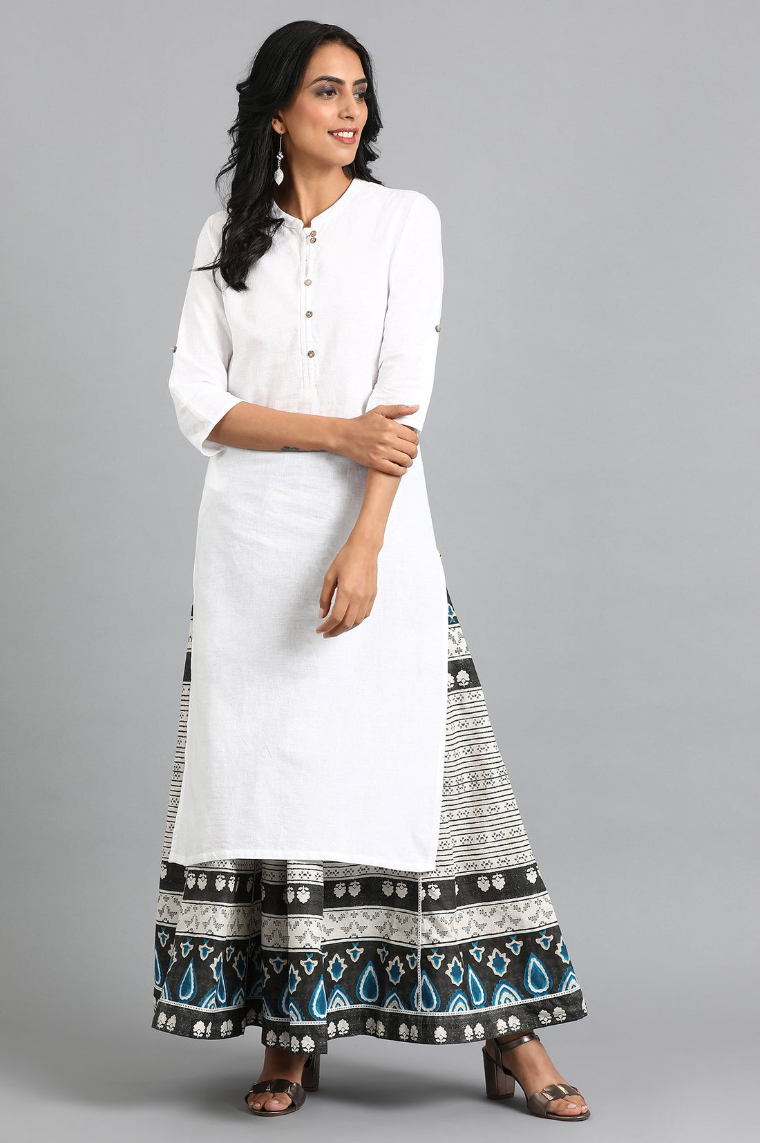 Blue flared culottes with printed detail.