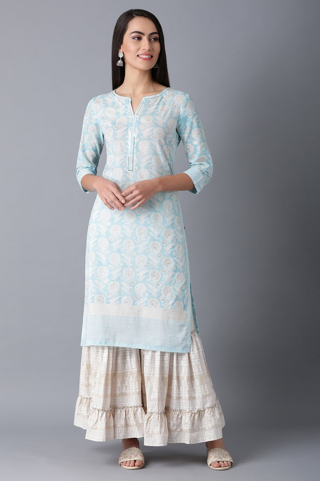 Blue round neck kurta with floral printed detail and silver hints at the neck.