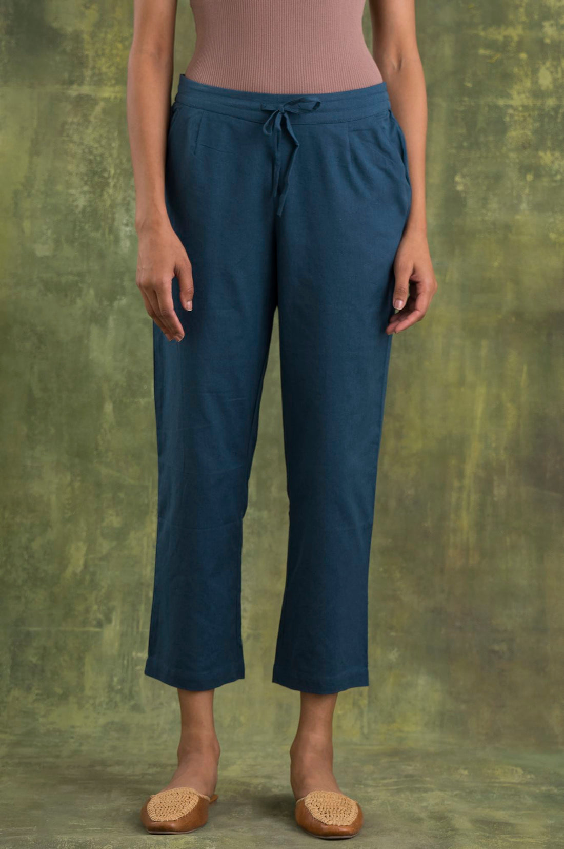 Blue Solid Straight Pants In Cotton Flax, Features Drawstring Detail And Side Pockets.