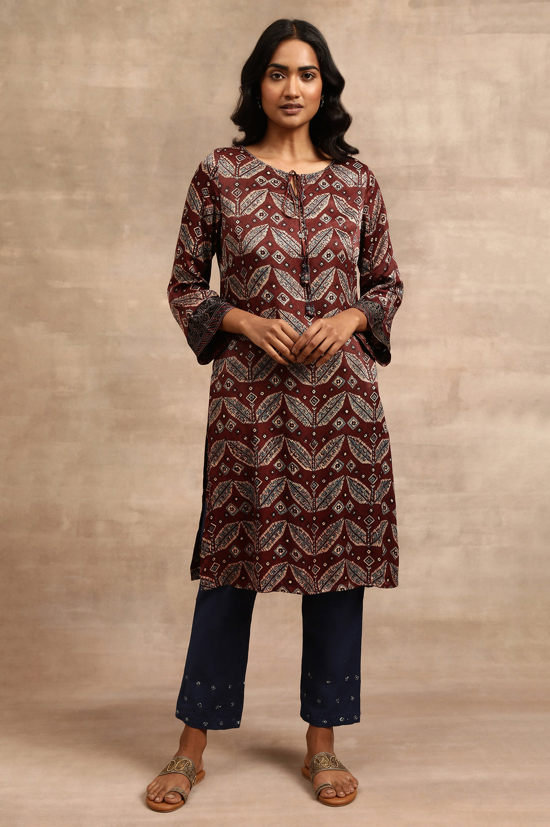 A Straight kurta In Fluid Modal Satin With Geometric Ajrakh Print, Features Delicate Embroidery At Neck And Dori Tie-Up With Handmade Tassel Detail.