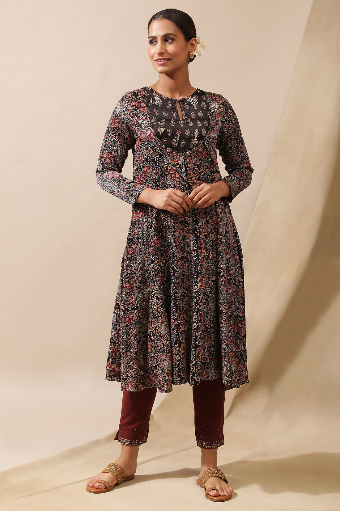 Embrace ethnic elegance with this exquisite brown kurta, designed for elevated occasions. Crafted from luxurious modal satin, this three-quarter sleeve kurta offers a perfect blend of comfort and style. The keyhole neckline adds a touch of sophistication, while the A-line silhouette flatters various body types. Adorned with a delicate floral print, this kurta showcases intricate craftsmanship and attention to detail. Made from 100% viscose, it drapes beautifully and feels soft against the skin. The woven construction technique ensures durability and a polished finish. Whether you're attending a family gathering or a festive celebration, this kurta will make you stand out with its timeless charm and contemporary flair.