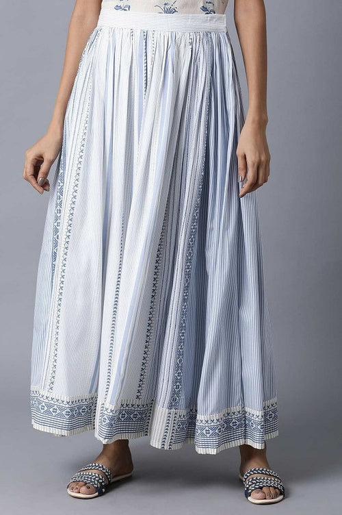 Ecru and Blue mix-match Panelled flared skirt in geometric print with hook-bar and zip.
