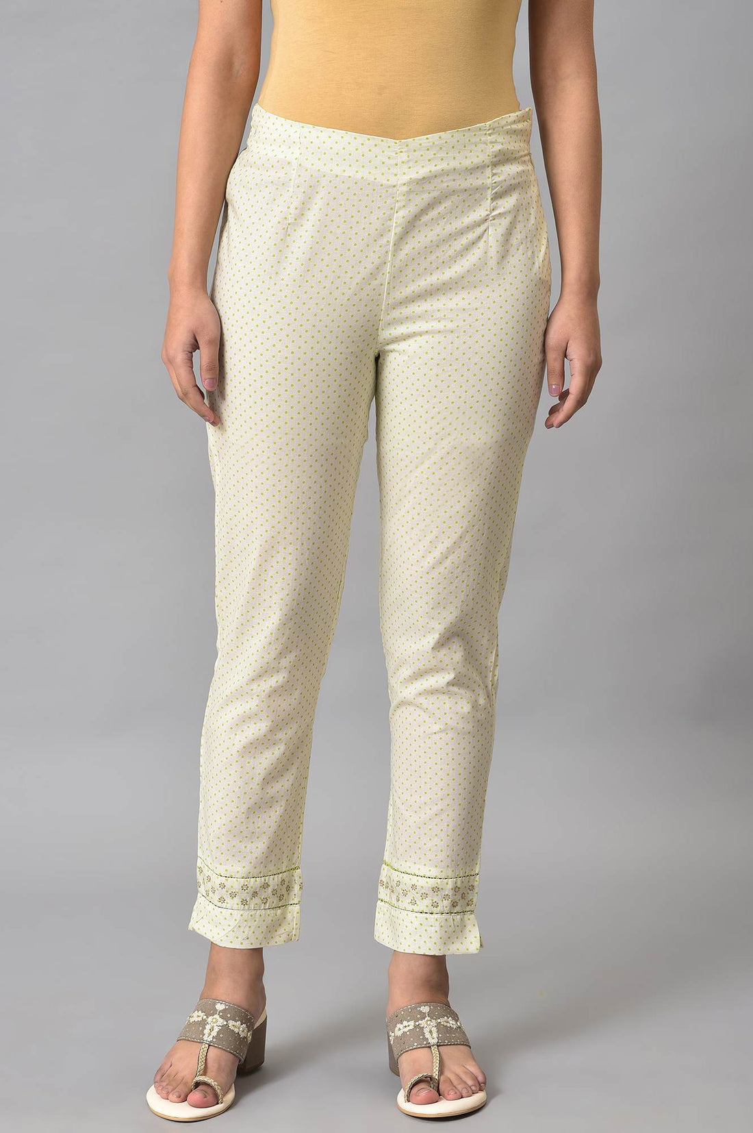Ecru Green Dotted Slim Pants With Lace Insert Slim Pants.
