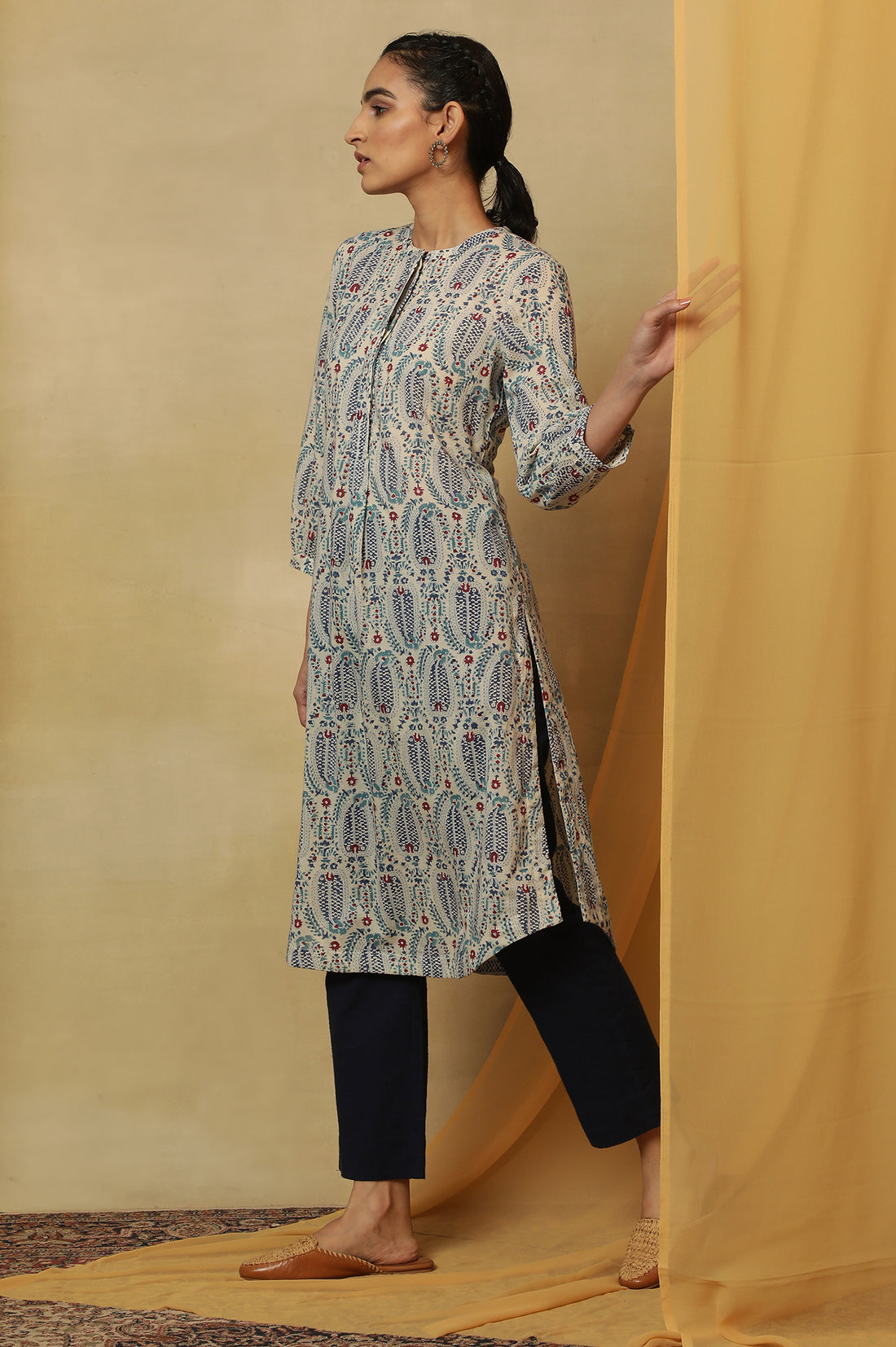 Discover the perfect blend of comfort and style with this exquisite off-white kurta. Designed for casual wear, this women's garment showcases the beauty of ethnic fashion. Crafted from 100% pure cotton, it offers breathability and softness for all-day comfort. The kurta features a straight cut and a classic band neckline, creating a timeless silhouette. The three-quarter sleeves add a touch of elegance, while the intricate paisley print brings a traditional charm to the design. This woven piece is a versatile addition to any wardrobe, suitable for various occasions. The attention to detail in its construction technique ensures durability and quality. Embrace the essence of ethnic fashion with this stunning kurta that combines simplicity with sophisticated design elements.