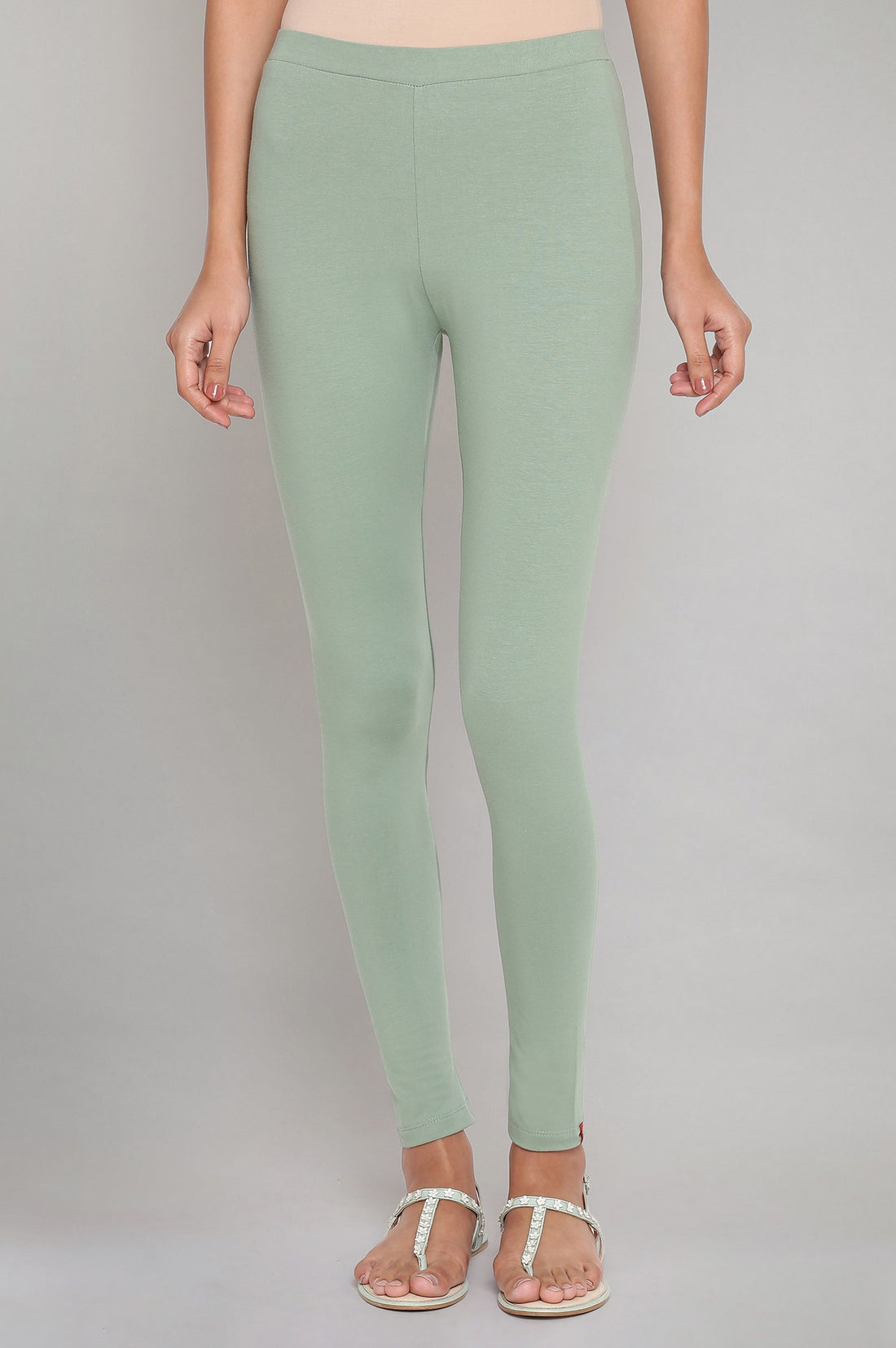 Spruce green coloured skin fit tights in mid-rise and elasticated waistband.