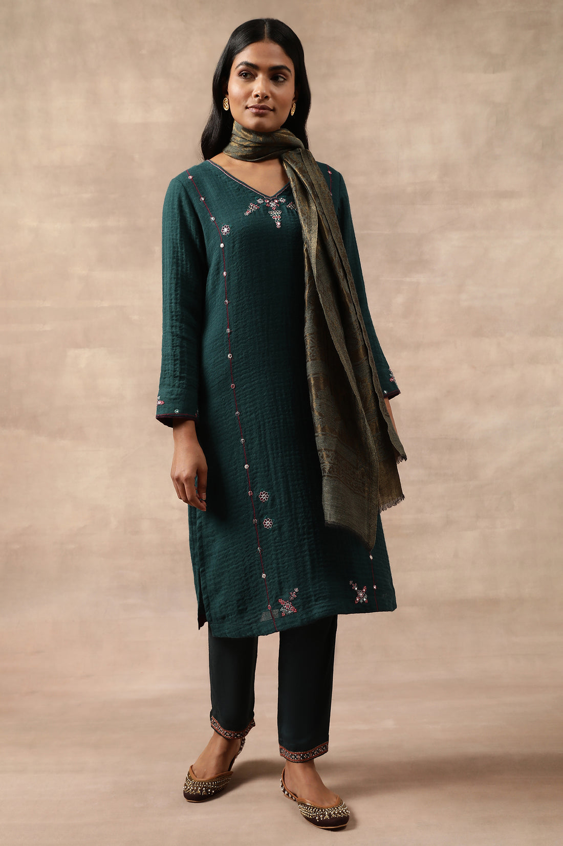 A Green Wool Blend Yarn Dyed Shawl With All Over Pattern.