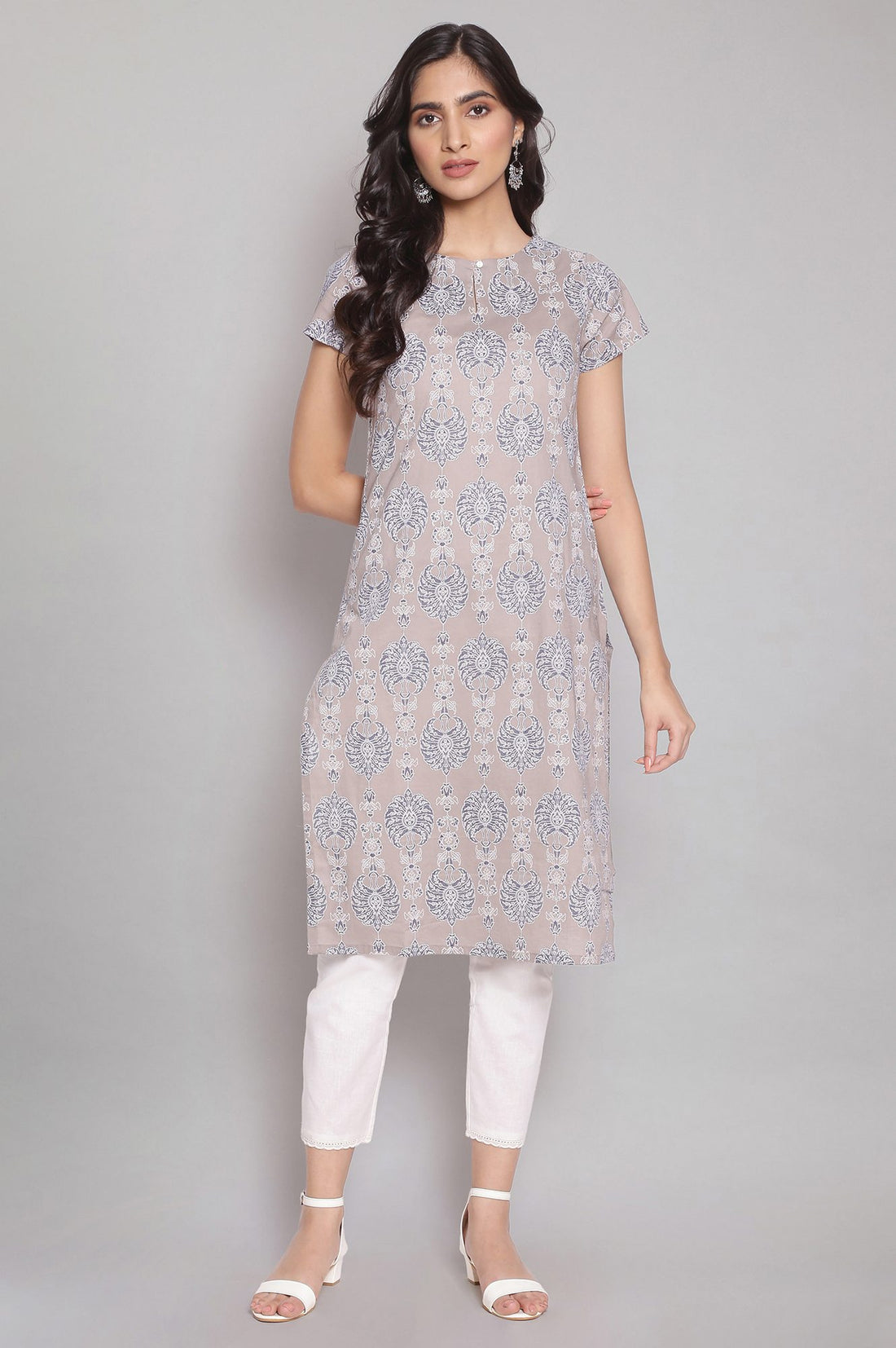 Grey coloured cotton straight kurta featuring floral print, a key hole neckline with button and cap sleeves.