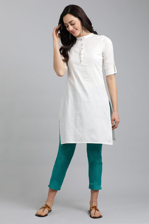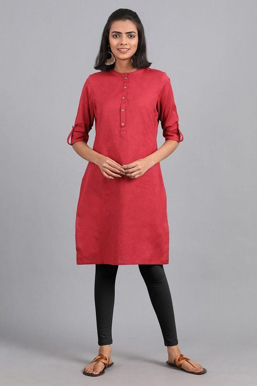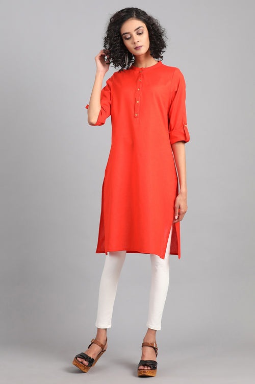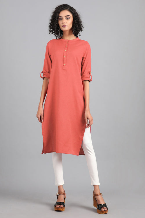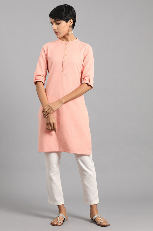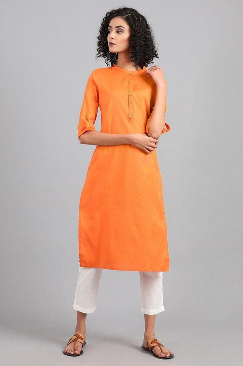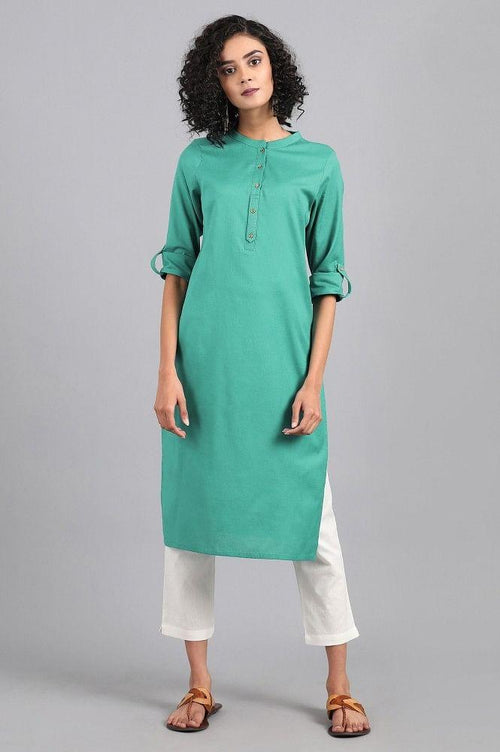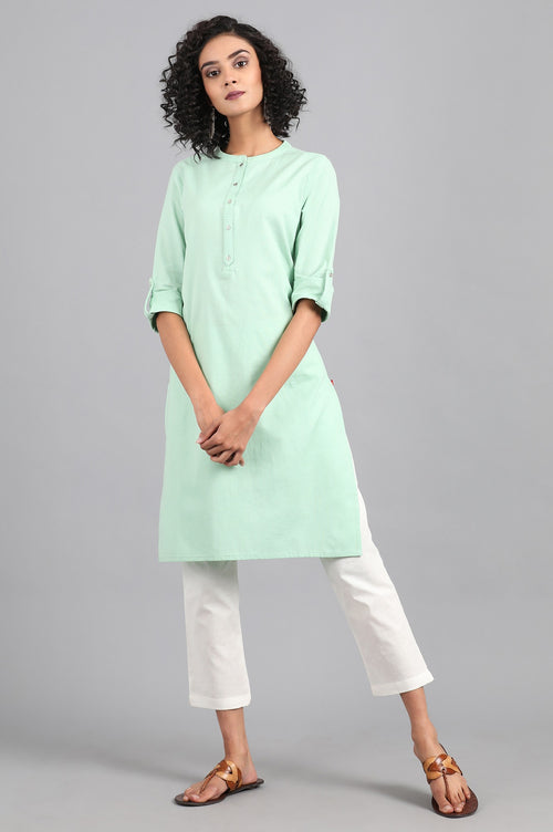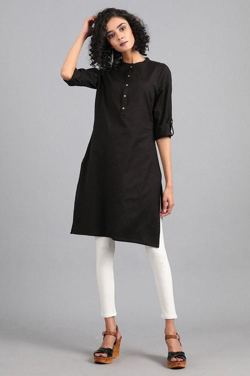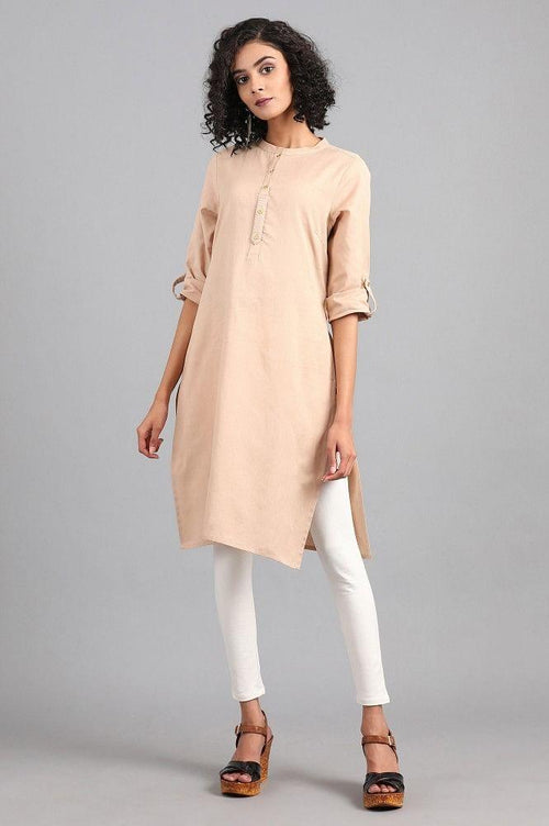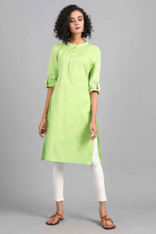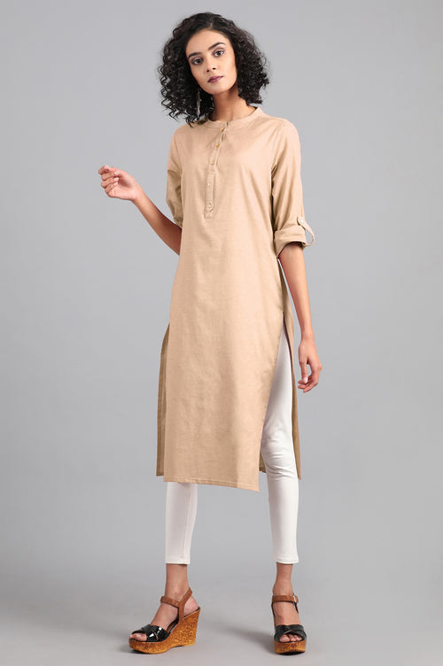 Grey mandarin neck solid kurta with button placket on the front. It is made up of cotton flax.