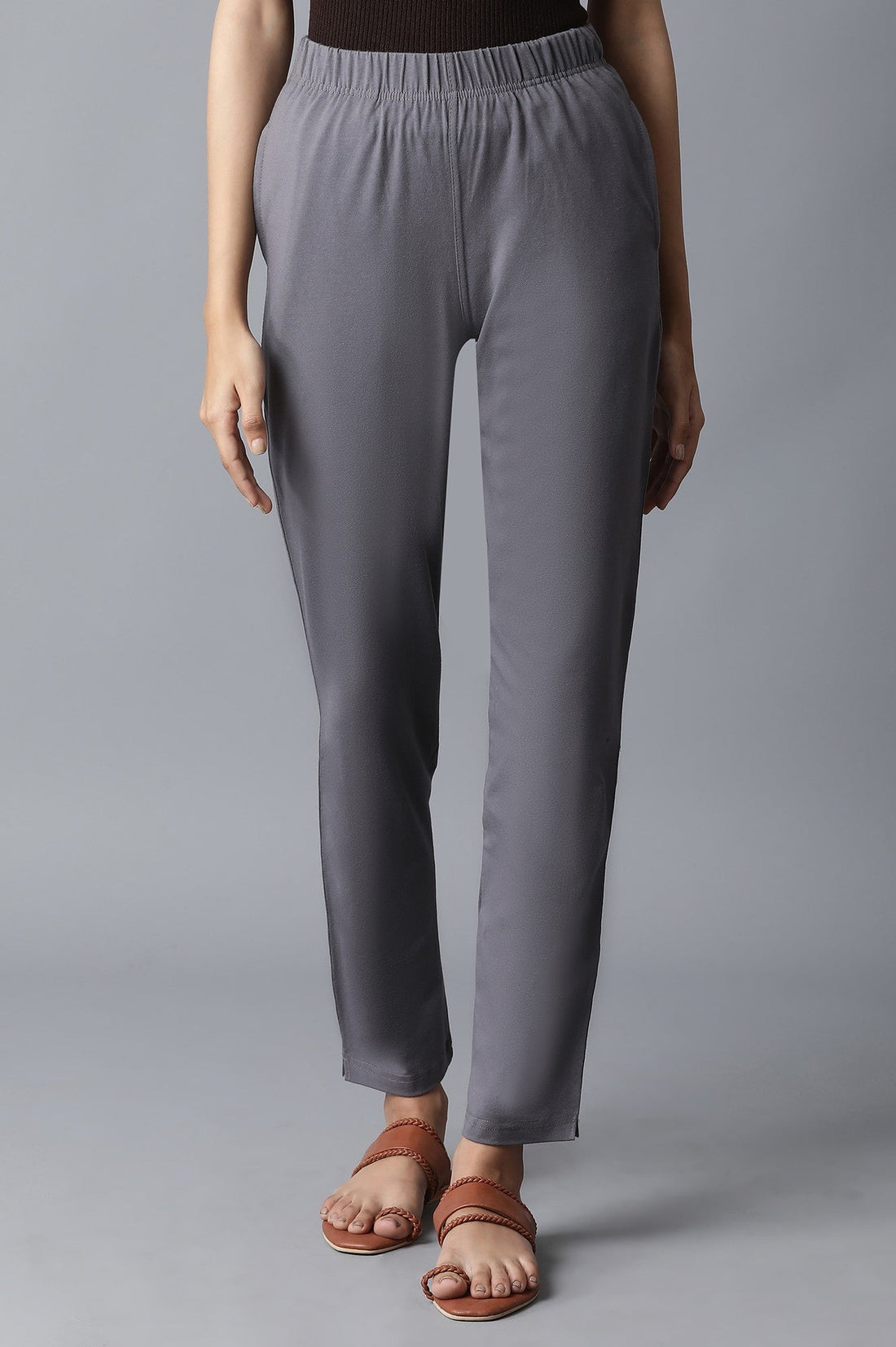 Experience the perfect blend of comfort and style with these grey straight-fit pants. Crafted from a soft cotton-spandex blend, these pants feature a mid-rise waist and an elasticated waistband for a secure fit. The solid pattern and knit fabric make them ideal for travel and casual outings. Pair them with tops or kurtas for a modish and comfortable look.