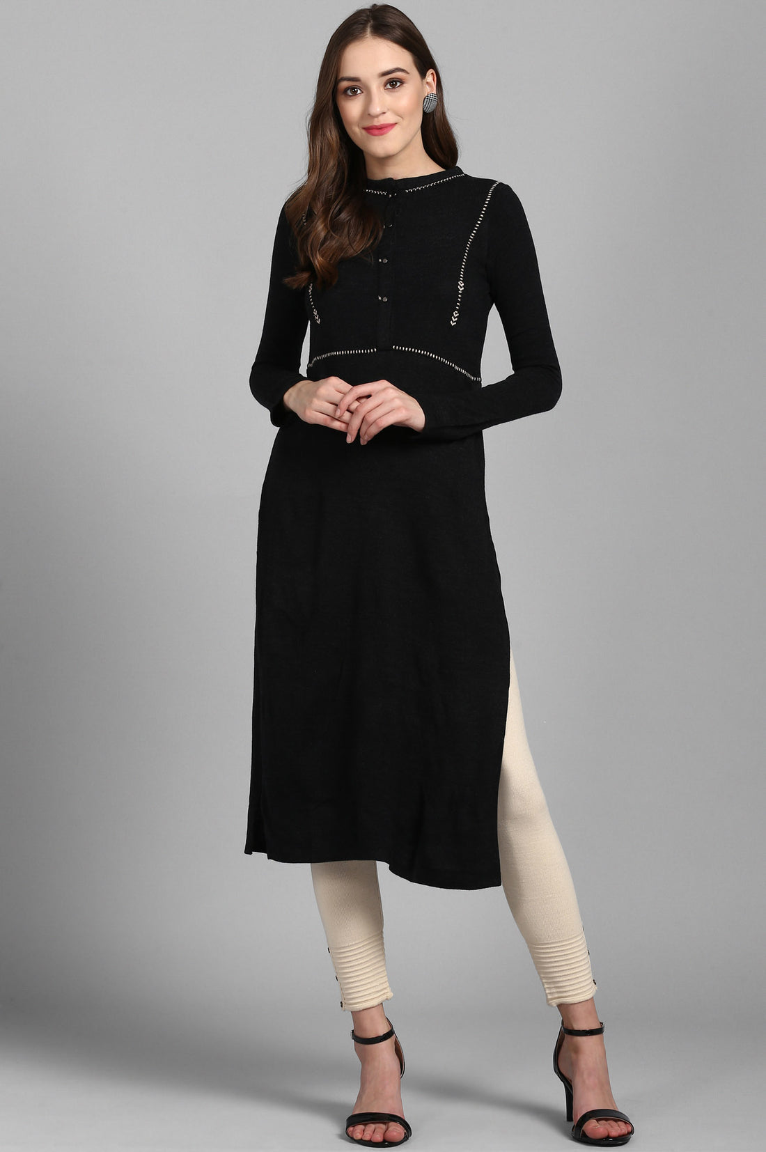 Grey Woollen leggings with placket detail at hem.