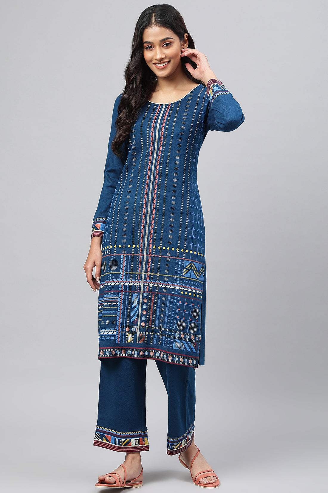 A Mid-Length kurta In Handblock Print With Traditional Ajrakh Technique, Features Half Placket And Embellished Buttons.