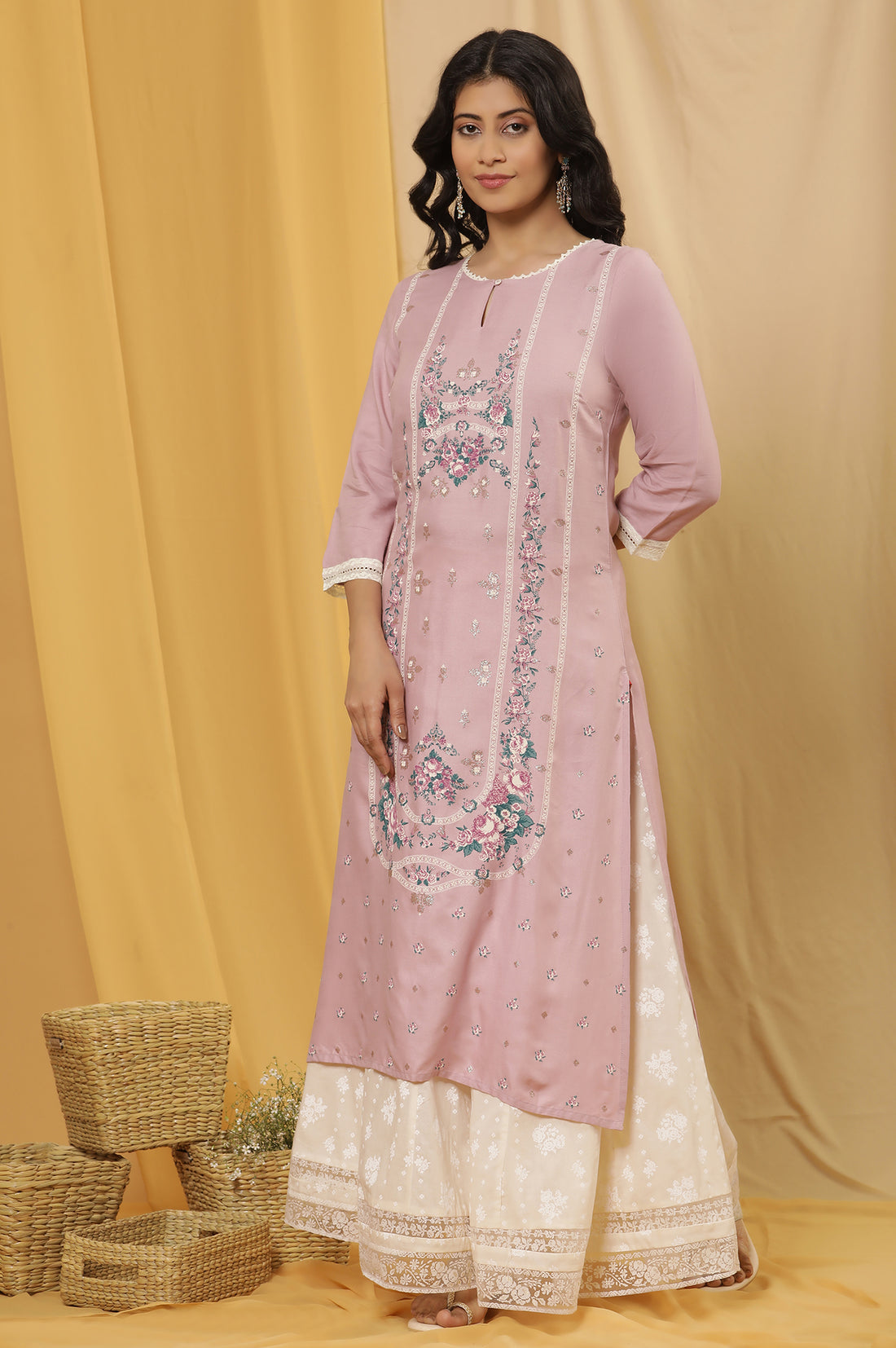 Get Ready For The Light Festive Look, With This Pretty Purple Printed Kurta And White Flared Culottes Set.