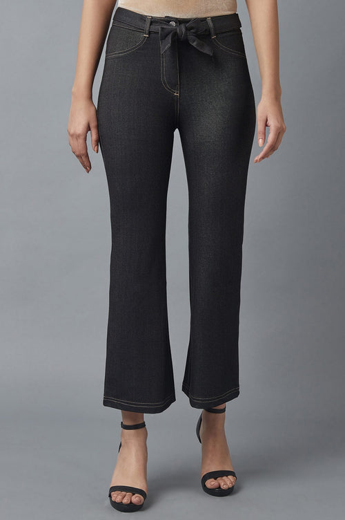 Crafted with precision, these navy blue boot-cut denim pants offer a chic silhouette with a mid-rise waist and partially elasticated waistband. The twill knitted fabric ensures comfort and durability, while the waist belt adds a stylish touch. Featuring two back pockets, these pants are perfect for casual outings. Pair them with a kurta or your favorite crop top and flats for a complete look.