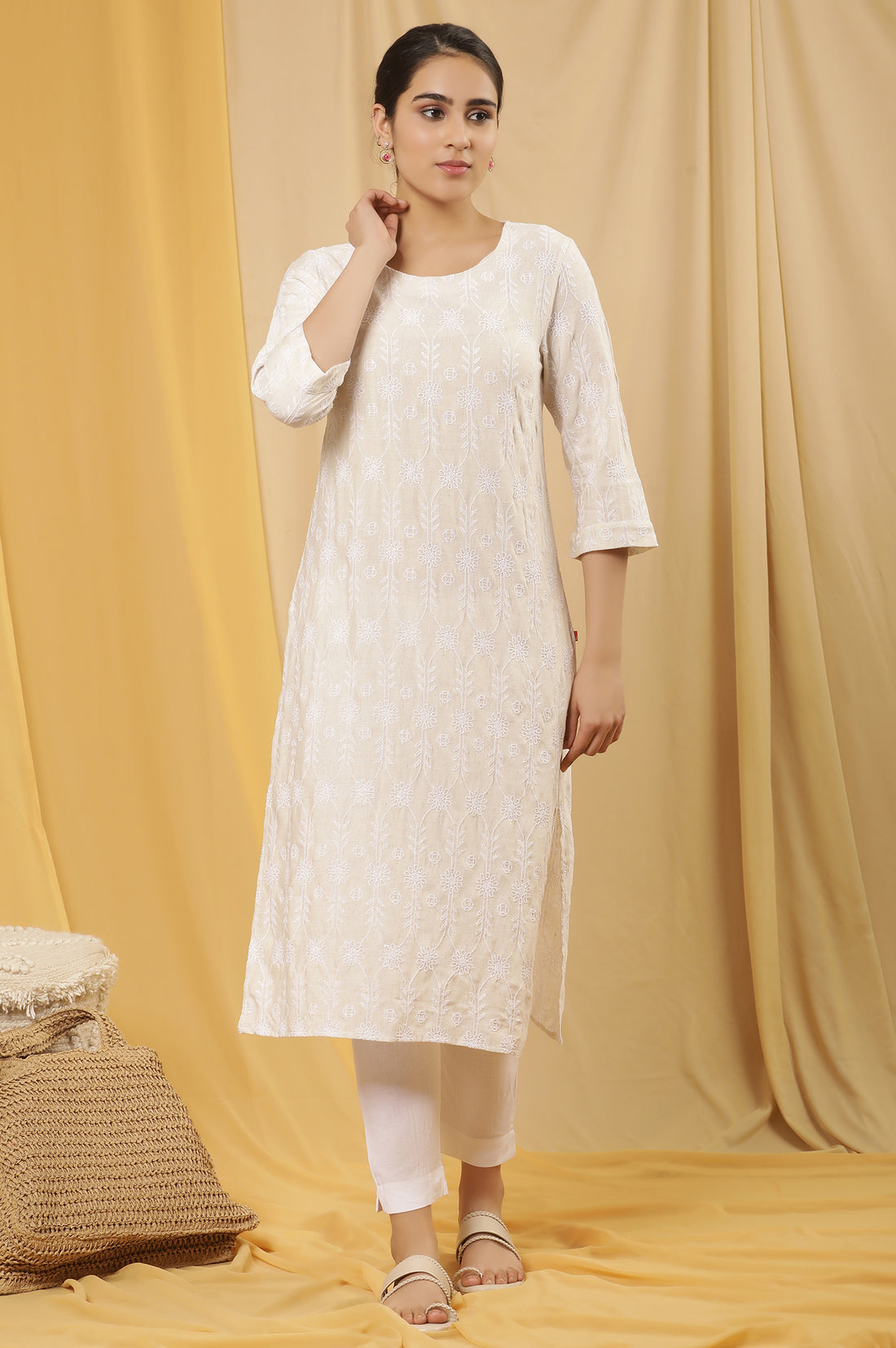 Elevate your ethnic wardrobe with this exquisite cream kurta designed for the modern woman. Crafted using a woven construction technique, this three-quarter sleeve kurta seamlessly blends style and comfort. The round neckline adds a touch of elegance, while the straight silhouette ensures a flattering fit for all body types. The kurta's embroidered details showcase intricate craftsmanship, making it perfect for casual outings. Made from a luxurious blend of 88% rayon and 12% flax, this kurta offers breathability and a soft feel against the skin. The rayon-flax fabric combination provides durability and a beautiful drape, making it a versatile addition to your wardrobe. Whether you're attending a family gathering or a casual lunch with friends, this ethnic kurta will make you stand out with its timeless appeal and superior comfort.