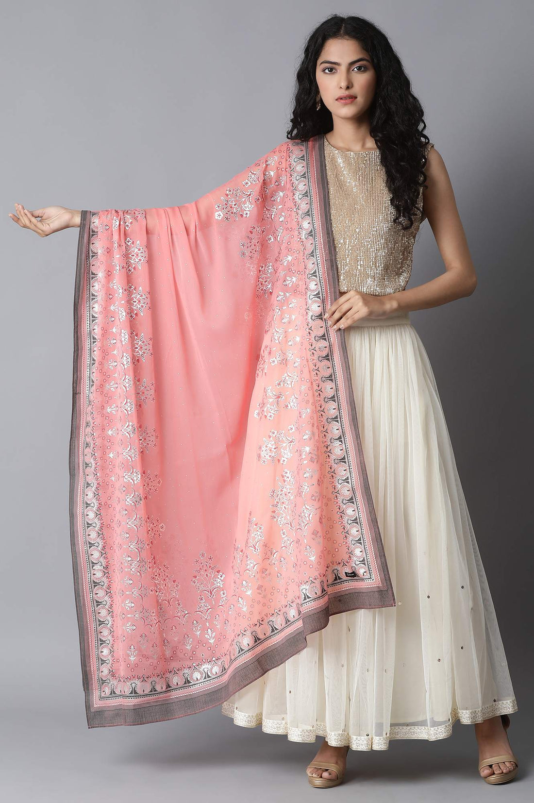 Shell pink chiffon foil print dupatta and having floral pattern.