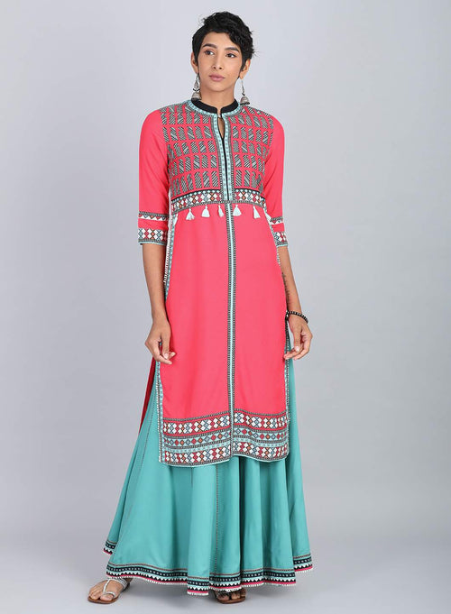 This pink mandarin neck 3/4 sleeve kurta has printed detail and tassels on the front.
