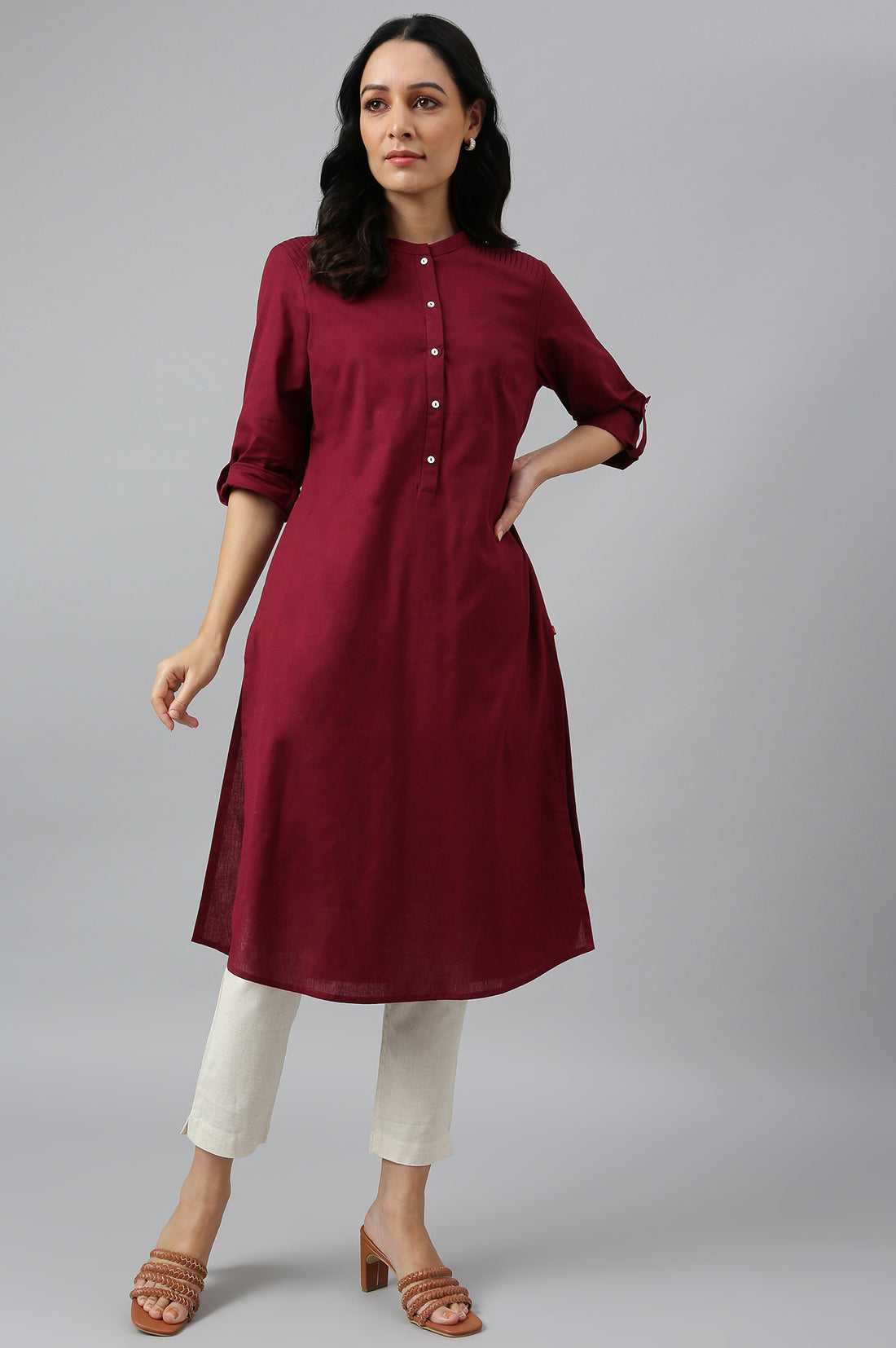 Elevate your casual wardrobe with this elegant women's ethnic kurta. Featuring a sophisticated maroon hue, this straight-cut kurta is designed for comfort and style. The three-quarter sleeves provide versatility, while the band neckline adds a touch of refinement. Crafted using a woven construction technique, this kurta is made from a premium blend of 88% cotton and 12% flax, ensuring breathability and durability. The solid color design makes it a versatile piece that can be easily paired with various bottoms and accessories. Perfect for casual outings, this kurta combines traditional charm with contemporary aesthetics, making it a must-have addition to any fashion-conscious woman's wardrobe.