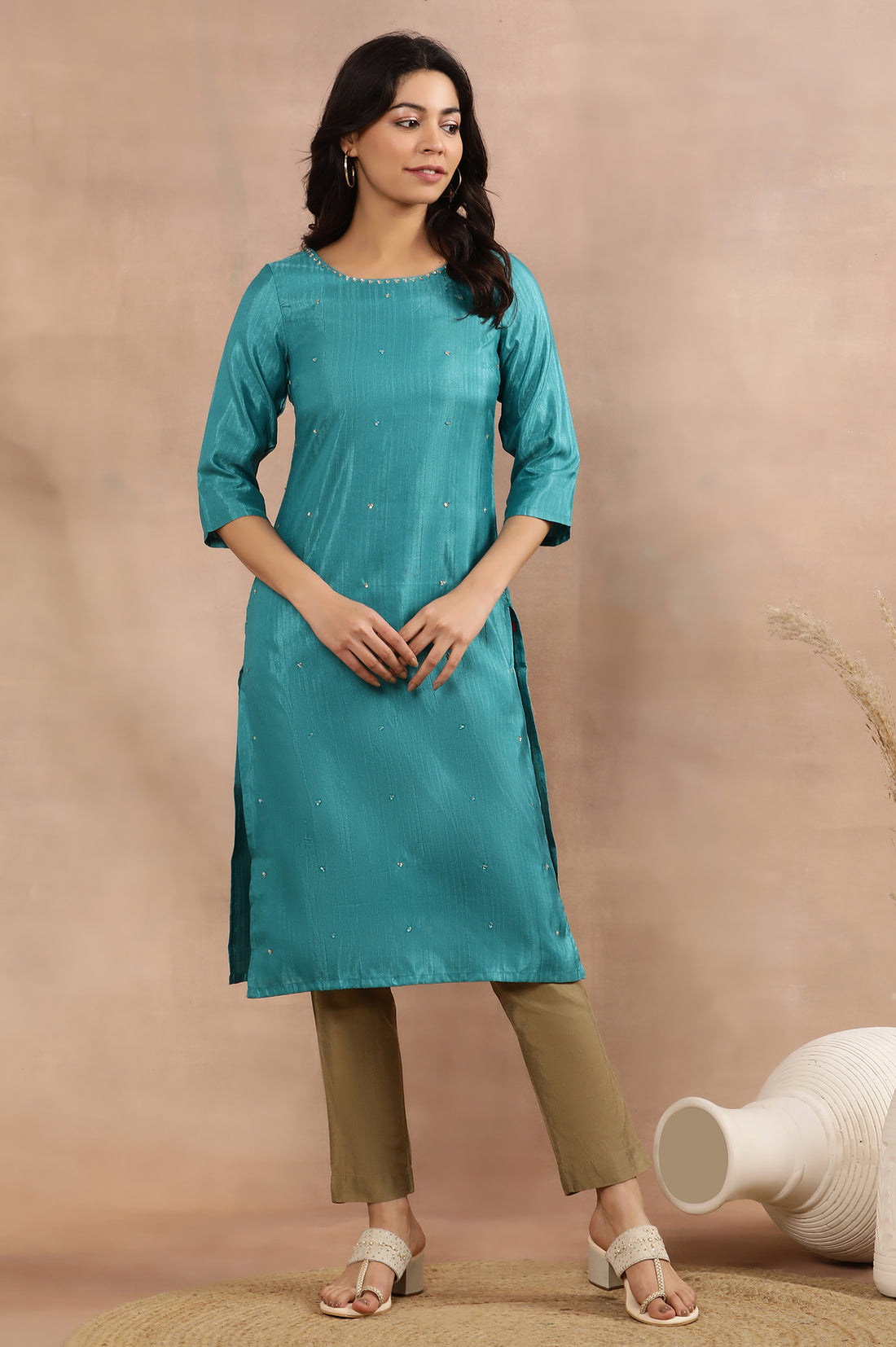 Teal Coloured Karnatak Silk Kurta In Straight Silhouette It Is Embellished With Sequins. The Kurta Is Paired With Golden Slim Pants.