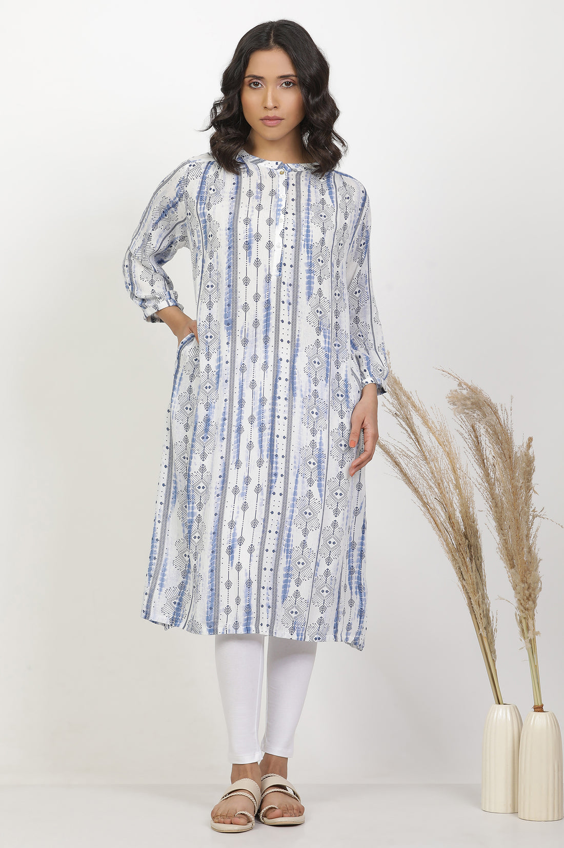 For A Summer Brunch Date, This Pretty W Kurta Set Is A Great Pick . The Kurta Has Blue Prints All Over And Has Mandarin Collar With Half Button Placket. The Kurta Is Paired With White Trouser Pants.