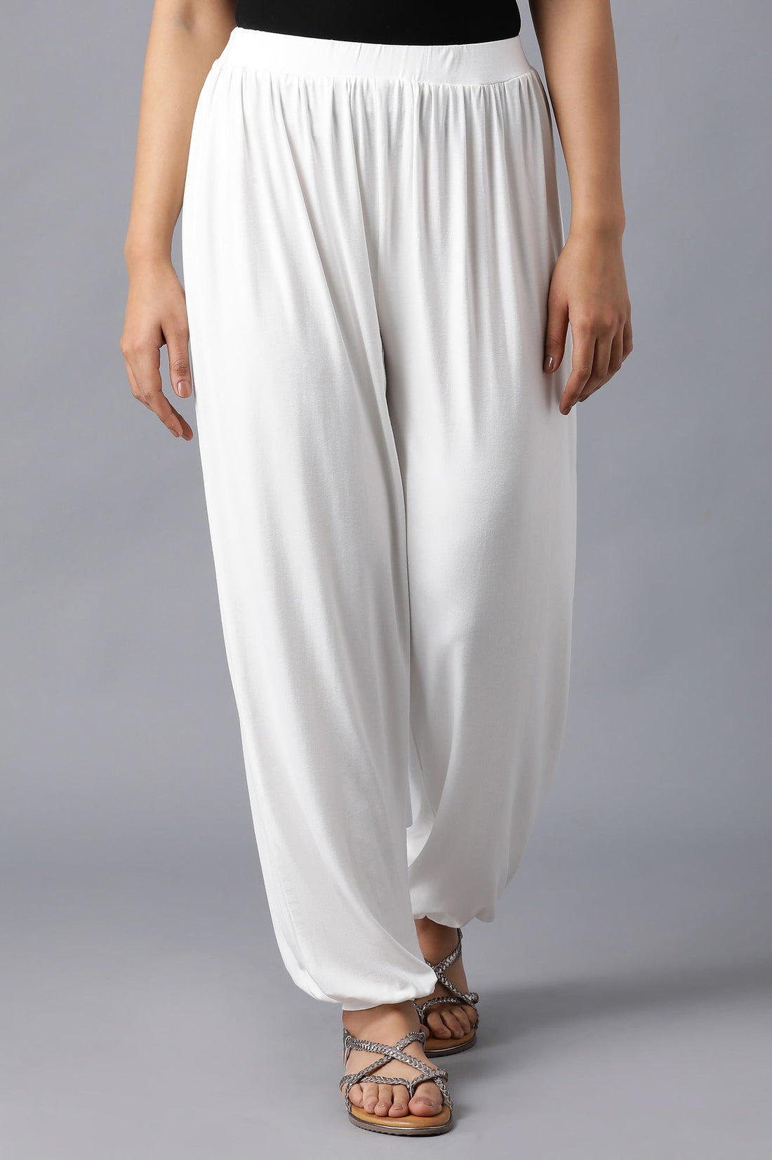 Crafted for effortless elegance, these white solid flared palazzo pants are a wardrobe essential. Made from soft knit fabric, they offer a fluid drape and a comfortable slip-on design with an elasticated waistband. Perfect for casual outings, these palazzos pair beautifully with pastel tops or kurtas, adding a chic touch to your everyday style.