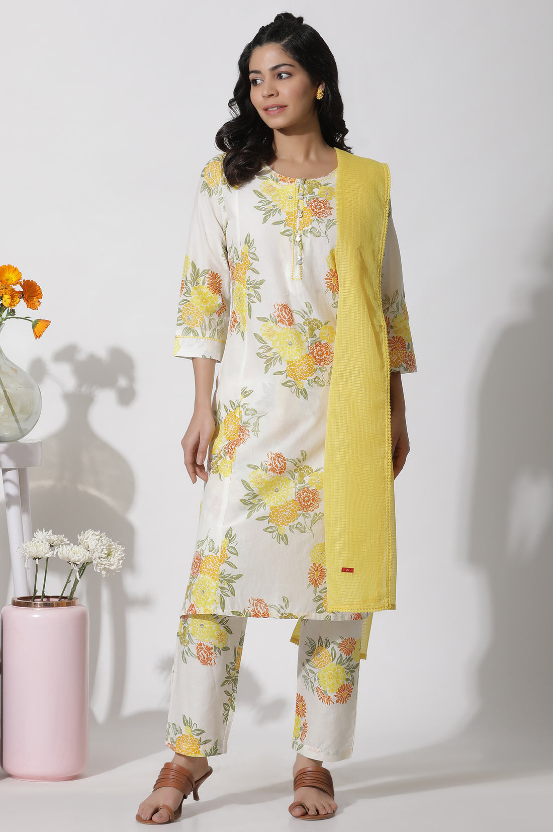Elevate your casual wardrobe with this exquisite ethnic set featuring a kurta, straight pant, and dupatta. Crafted from 100% pure cotton, this ensemble offers both comfort and style. The kurta boasts a charming floral print, adding a touch of feminine grace to your look. The round neckline and three-quarter sleeves provide a classic silhouette, while the straight cut ensures a flattering fit. Perfect for casual occasions, this white ethnic set is a versatile addition to any woman's wardrobe. The woven construction technique guarantees durability and quality, making it a reliable choice for everyday wear. Embrace your ethnic roots with this stunning ensemble that combines traditional elements with contemporary design.