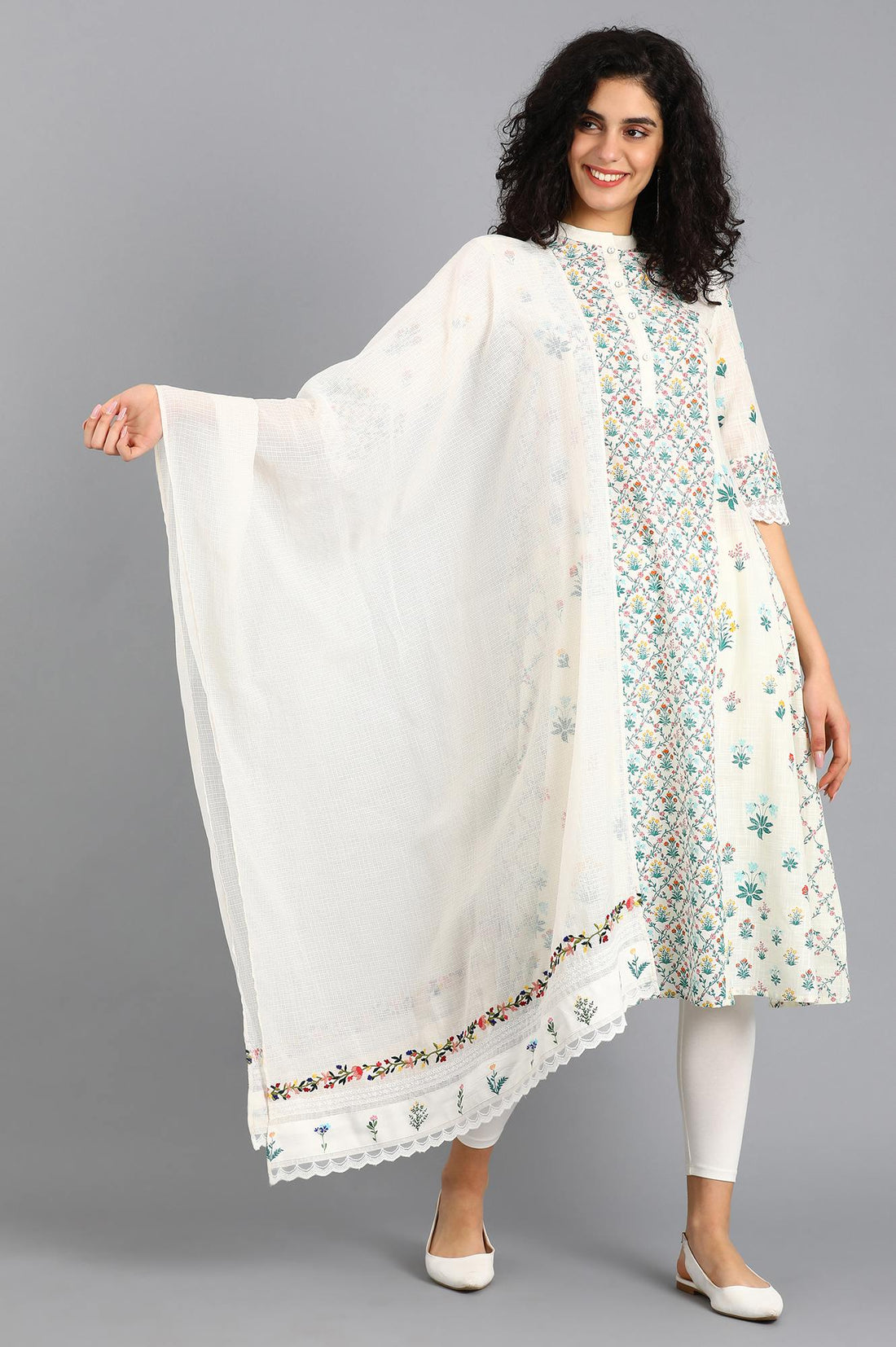 White solid dupatta with printed border detail and lace at both ends.
