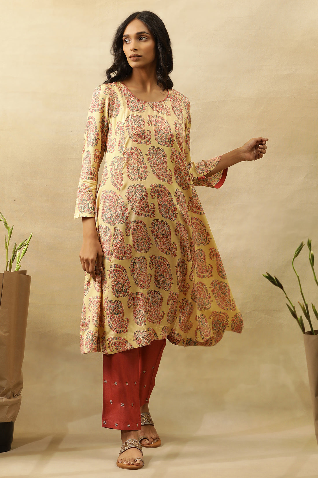 A Yellow Hand Block Printed Shantung Kurta With Round Scoop Neck And A Slit Detail At Back. Neck Is Beautiful Highlighted With Delicate Hand Embroidery Work And Further Accented With Contast Piping Detail. Sleeves Are Curved At Hem With Button Opening.