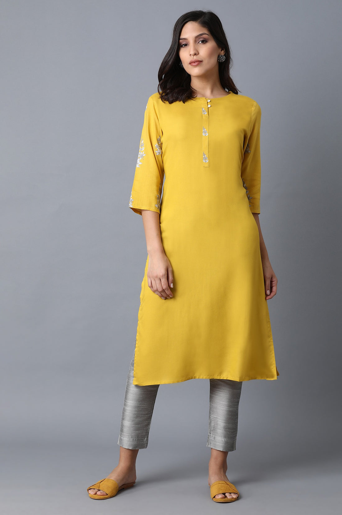 Pair this mustard yellow kurta with silver pants and flats to get the stylish look.