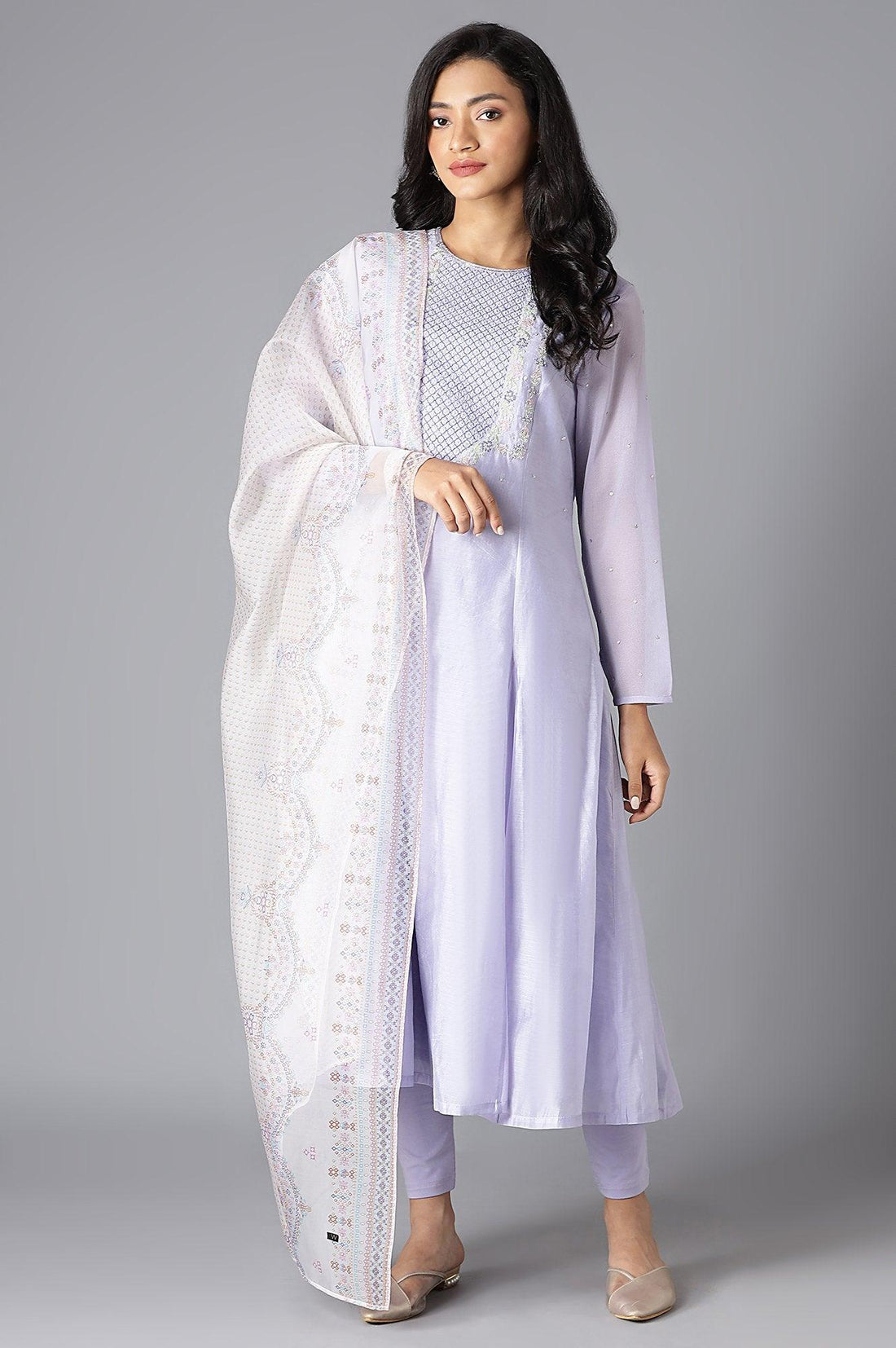 Add An Elegance In Your Look With This Classy And Stylish Lilac Coloured Contemporary Set. The Set Includes A-Line kurta Having Embroidered On Yoke And It Is Coordinated With Matching Coloured Tights And Dupatta.