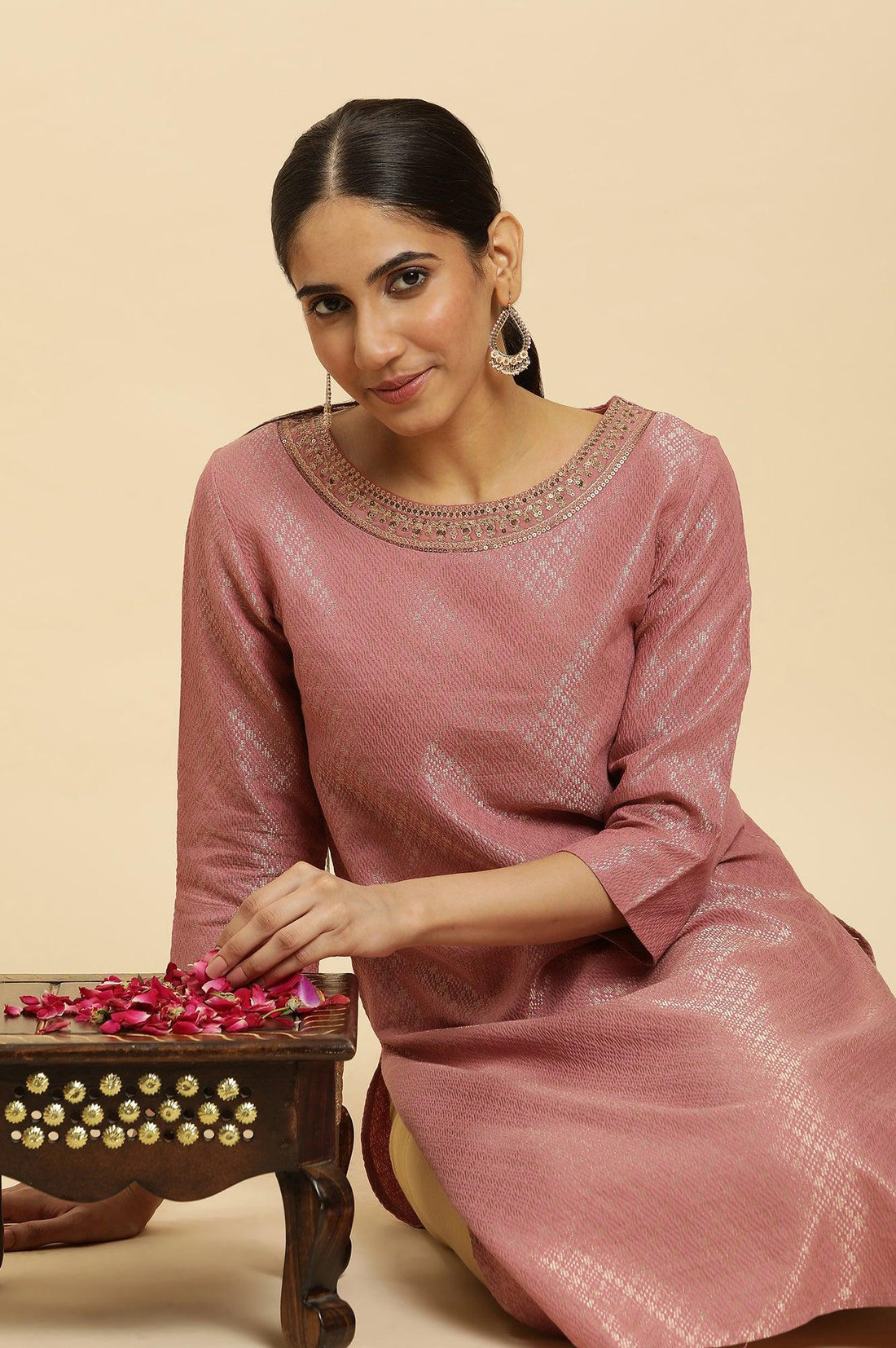 Elevate your ethnic wardrobe with this exquisite purple kurta designed for women who appreciate traditional craftsmanship with a modern twist. Crafted from a luxurious blend of 85% cotton and 15% zari, this straight-cut kurta offers both comfort and style. The dobby weave adds a subtle texture, while the geometric print brings a contemporary flair to the classic silhouette. Perfect for special occasions, this kurta features a round neckline and three-quarter sleeves, making it ideal for various seasons. The woven construction technique ensures durability and a premium feel. This versatile piece seamlessly combines ethnic charm with contemporary design, making it a must-have addition to your festive wardrobe.