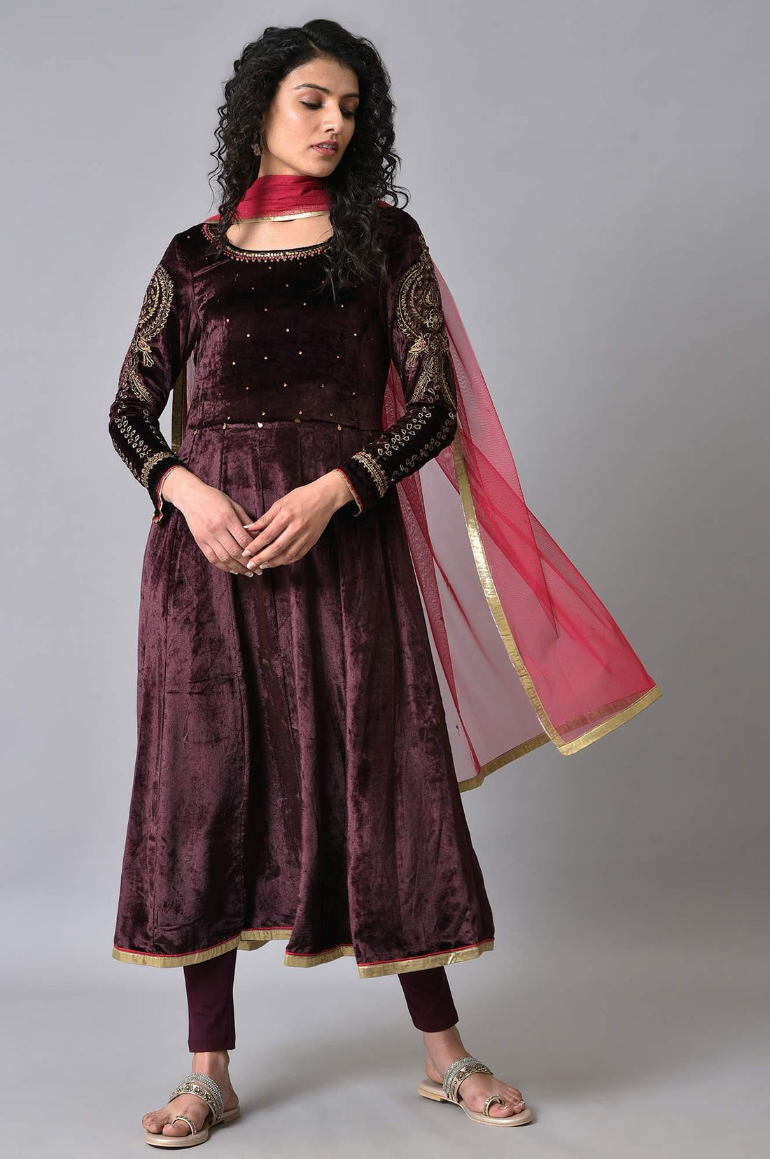 Elevate your ethnic wardrobe with this stunning burgundy ethnic set. Crafted from 100% man-made fiber, this ensemble exudes elegance and sophistication. The set features intricate zari embroidery, showcasing exquisite craftsmanship and attention to detail. The woven construction technique ensures durability and comfort. The flared style adds a touch of grace to your silhouette, while the three-quarter sleeves offer versatility for various occasions. The round neckline complements the overall design, making it suitable for elevated events. This women's ethnic set is perfect for those who appreciate traditional aesthetics with a modern twist. Pair it with stylish sandals to complete the look, exuding effortless elegance. Versatile and timeless, this outfit is perfect for making a statement at any occasion, day or night.