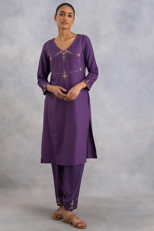 Elevate your ethnic wardrobe with this exquisite purple kurta. Crafted from a luxurious blend of 88% viscose and 12% silk, this new silk viscose tussar garment offers a perfect balance of comfort and elegance. The kurta features a flattering v-neck and three-quarter sleeves, making it suitable for various occasions. Its straight silhouette ensures a sleek and modern look, while the embroidered details add a touch of traditional charm. The woven construction technique guarantees durability and a high-quality finish. This versatile piece is ideal for elevated events, allowing you to showcase your refined taste in ethnic fashion. The kurta's unique combination of contemporary design and classic elements makes it a standout choice for those who appreciate sophisticated style.