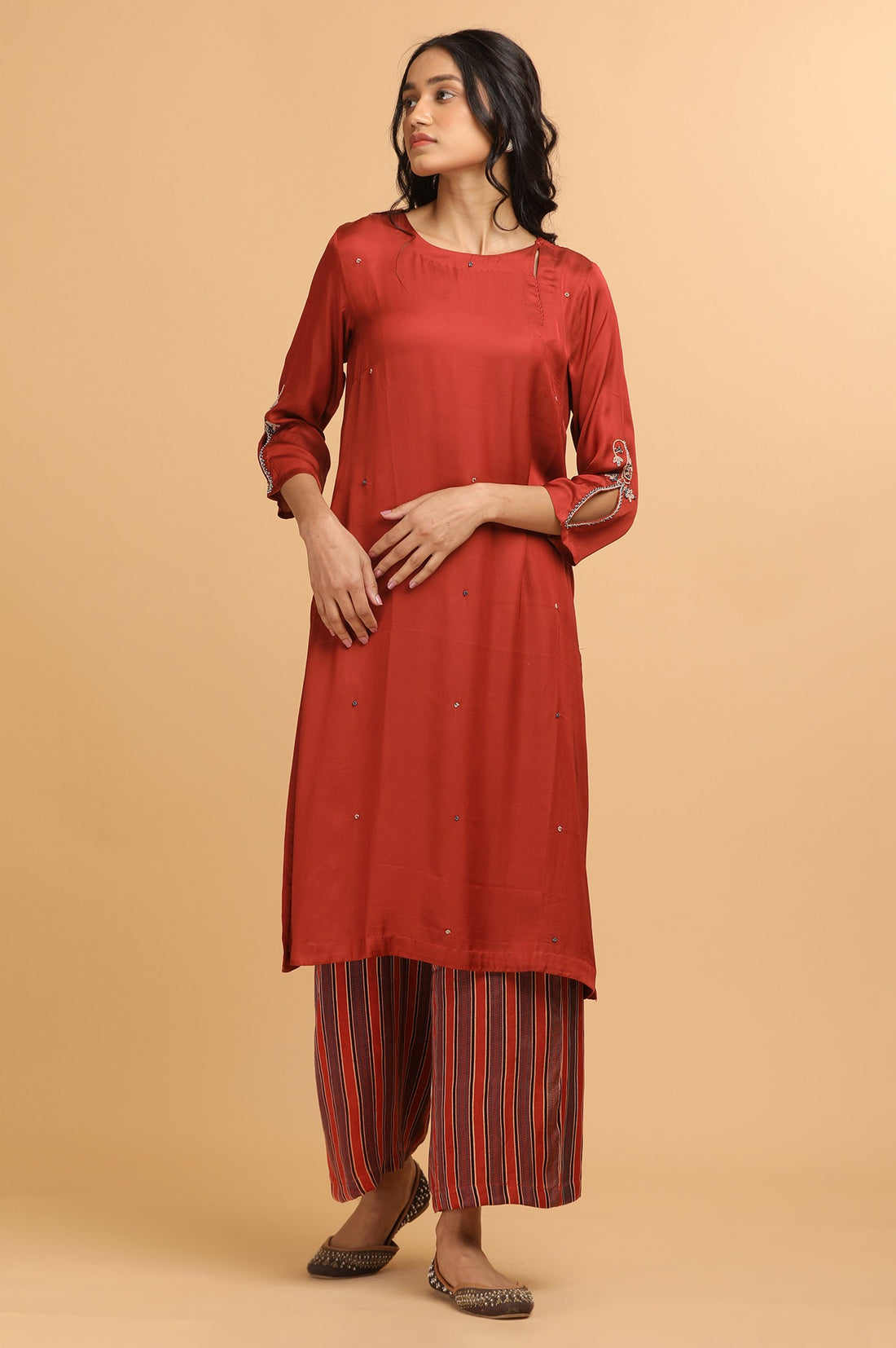 A crimson red modal satin kurta with side keyhole, features beadwork paisley on sleeves and cheent all over.