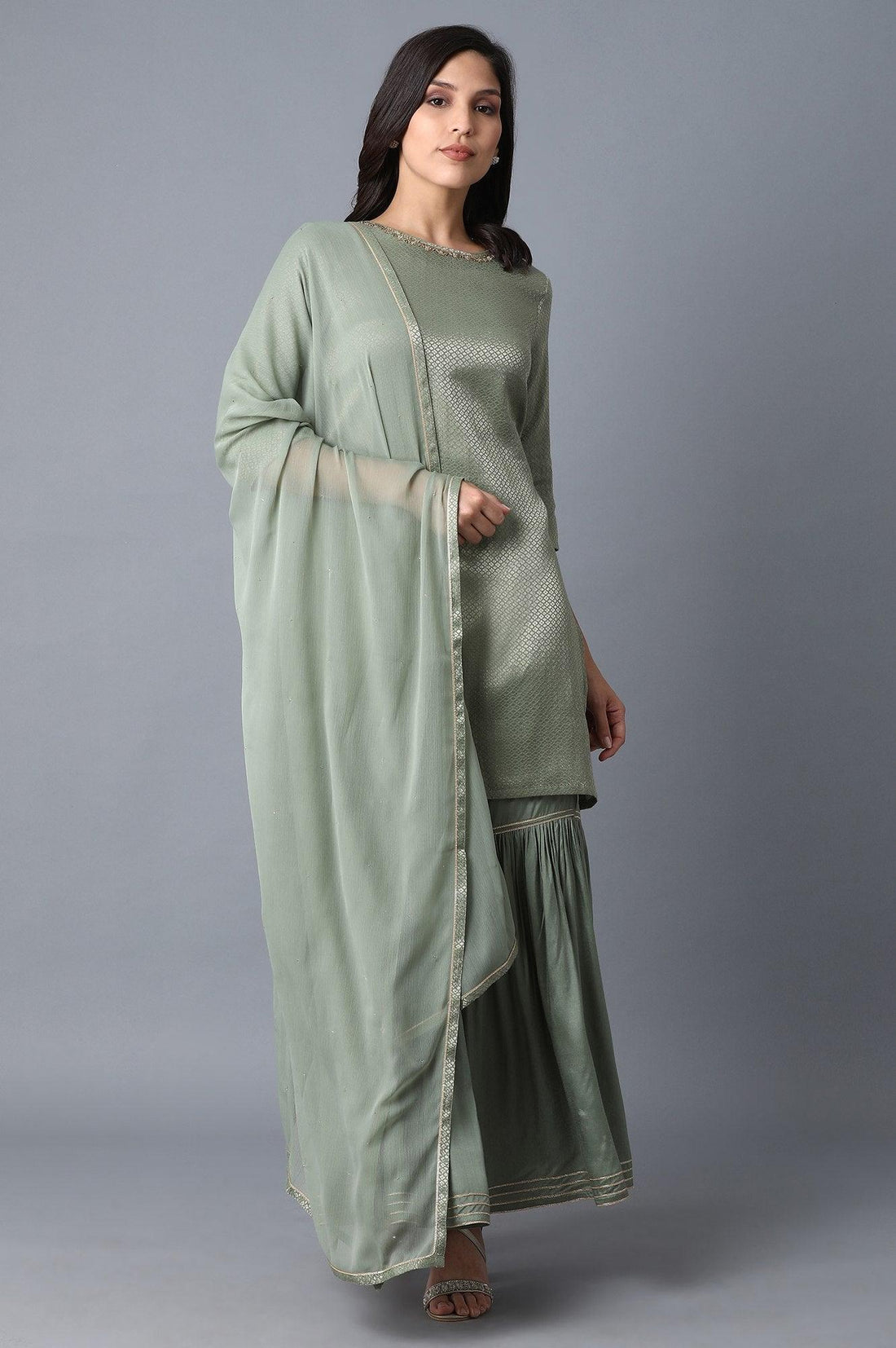 laurel green woven kurta with embroidered neck and matching sharara including dupatta.