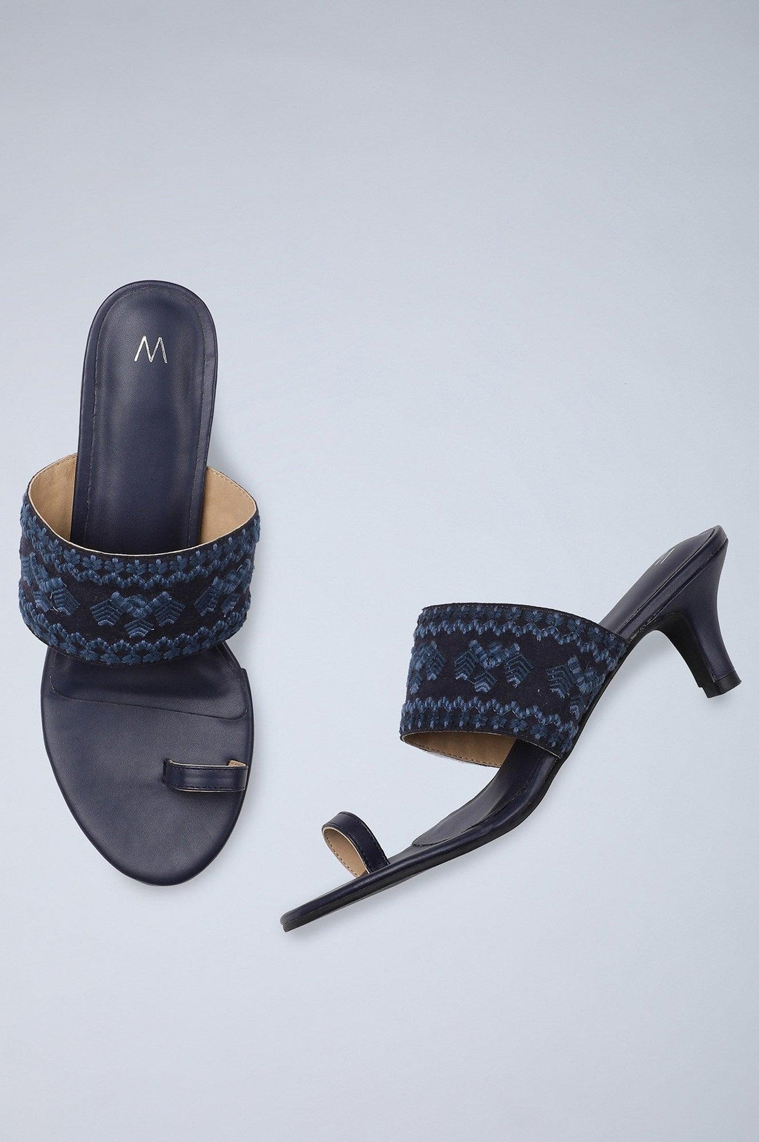 An intricately embroidered, tonal, toe ring sandal, with an Indian design touch in the upper & a sleek, comfortable kitten heel.