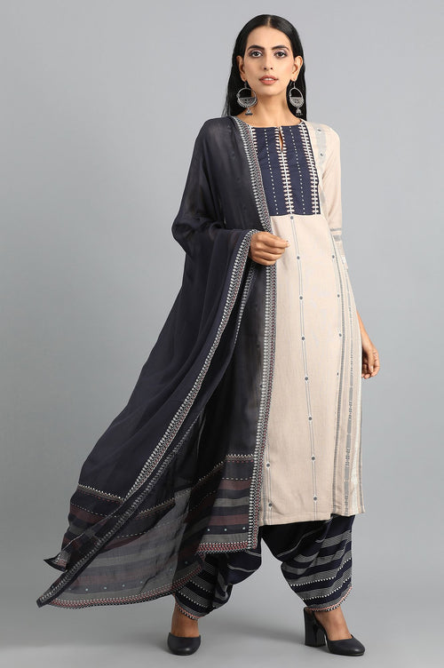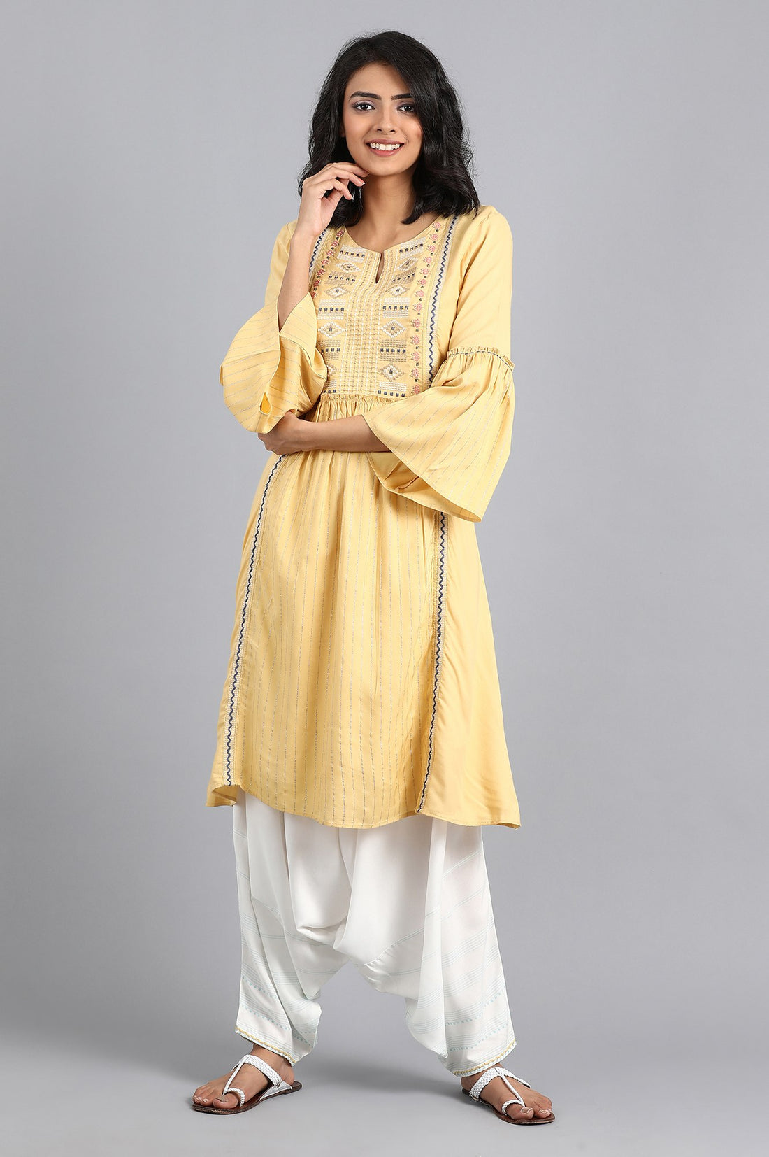 White draped pants with placement print and embroidery at hem.