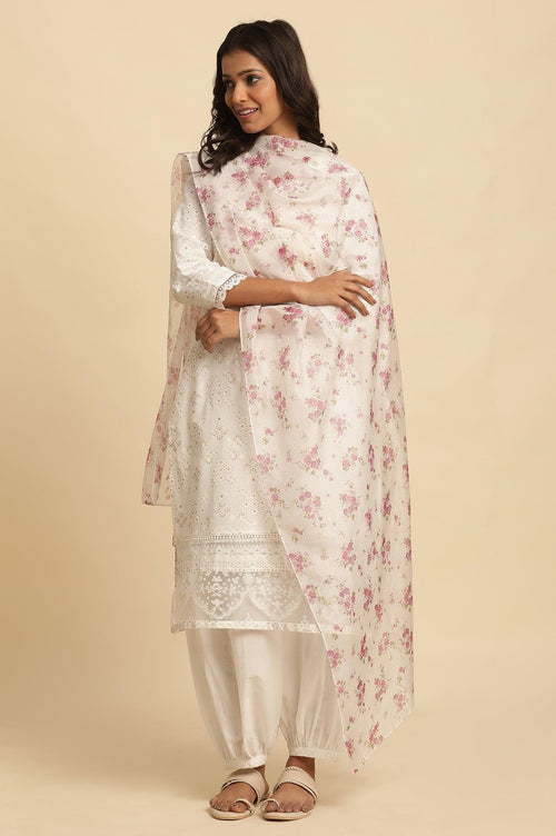 White Floral Printed Organza Dupatta