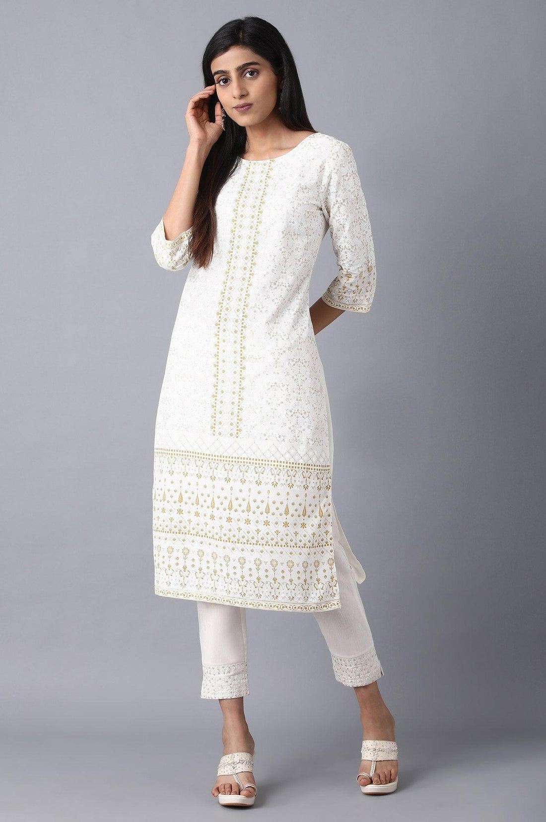 White Round Neck Glitter Print Livaeco kurta - wforwoman